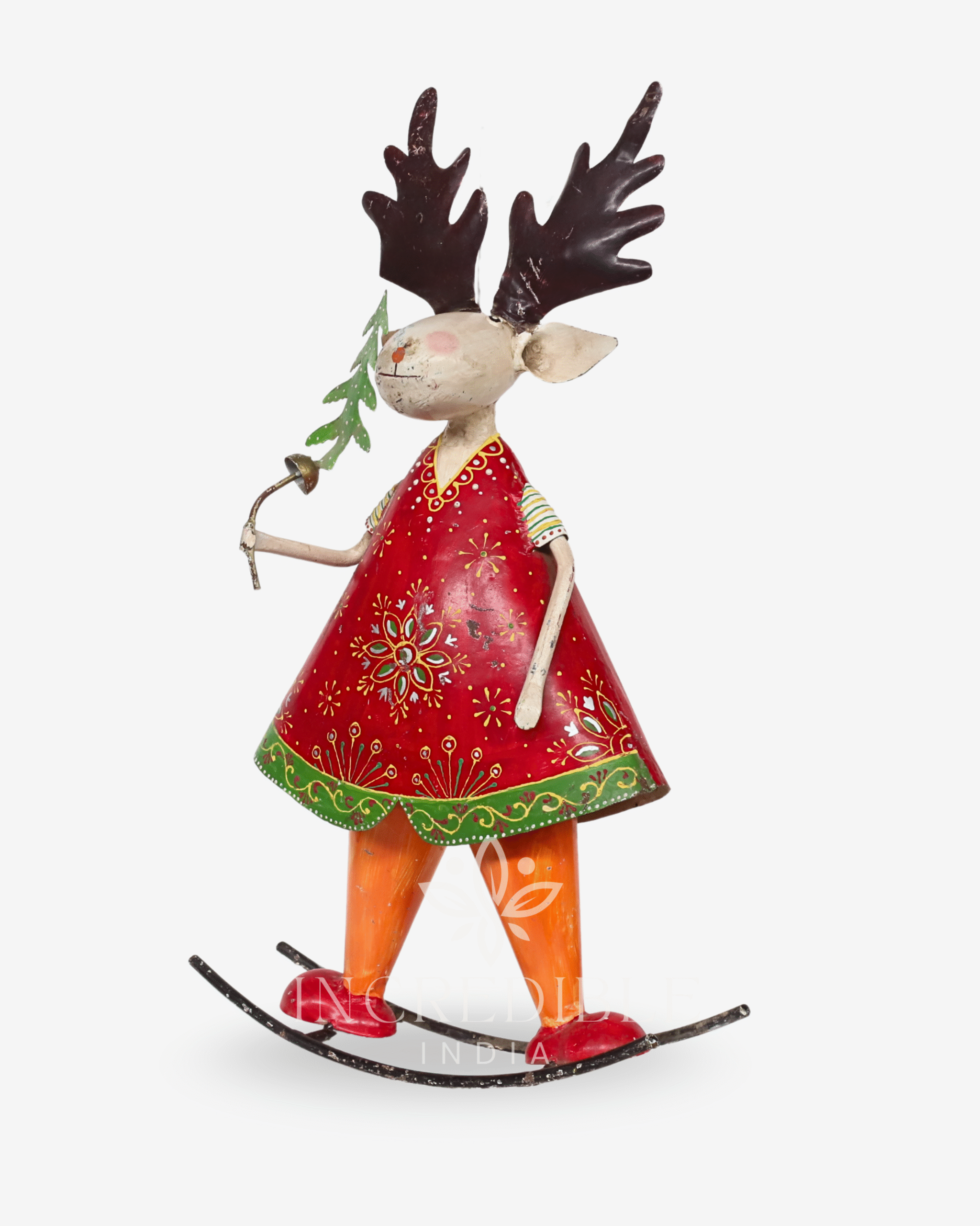 Brimming with holiday cheer and folk-art charm, this handcrafted reindeer girl figurine is a whimsical nod to the joy of the season. Dressed in a bright red frock adorned with hand-painted floral motifs and green scalloped trim, she stands poised on curved metal rockers—ready to dance through your winter décor. With playful orange leggings, striped sleeves, and oversized antlers, she holds a tiny tree and bell as if spreading magic wherever she goes.