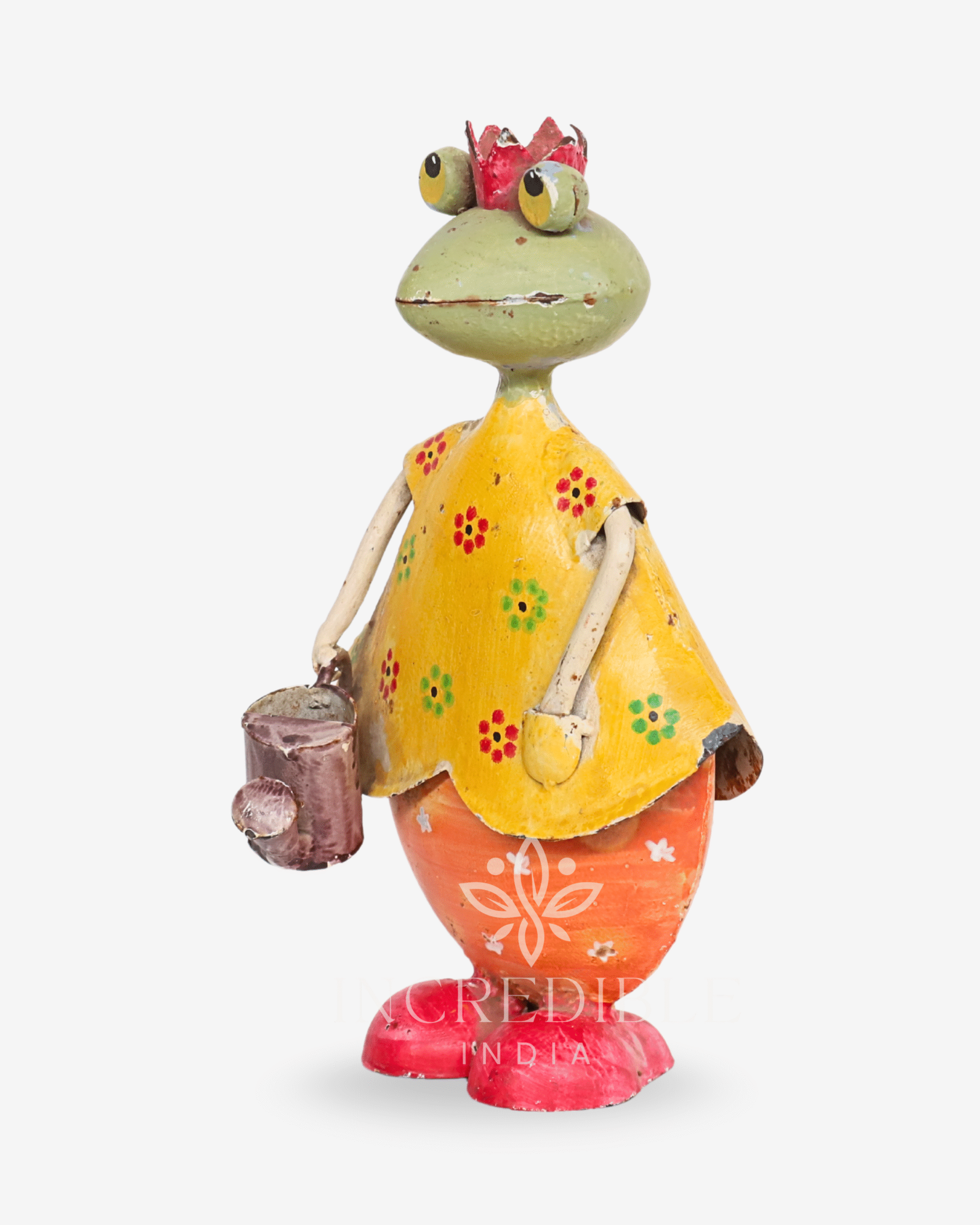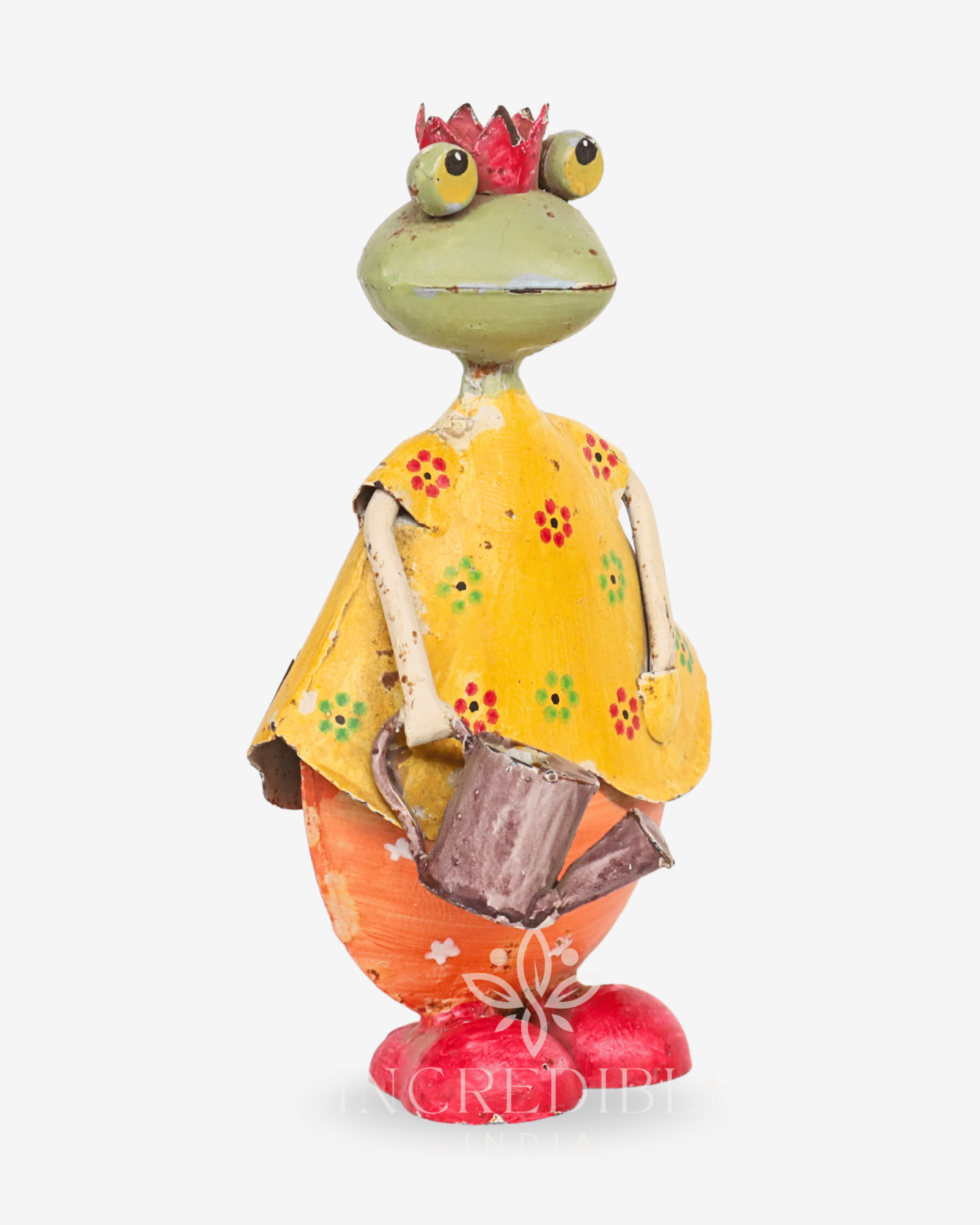 A delightful mix of royalty and garden charm, this handcrafted metal frog queen is dressed in a cheerful yellow floral dress, topped with a red crown and carrying a tiny watering can. Hand-painted with bright colors and rustic finishes, she adds a touch of whimsy and joy to any corner of your home.