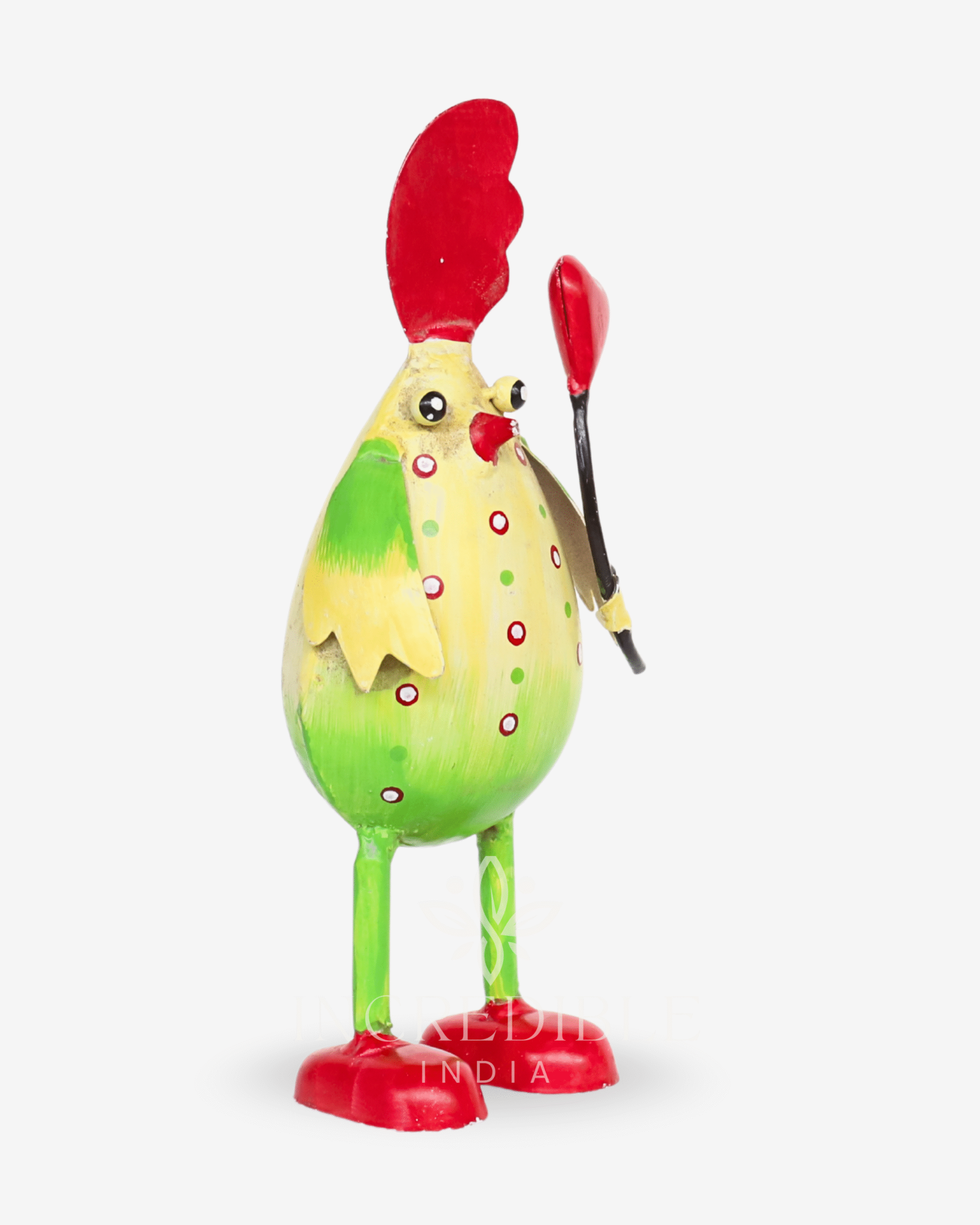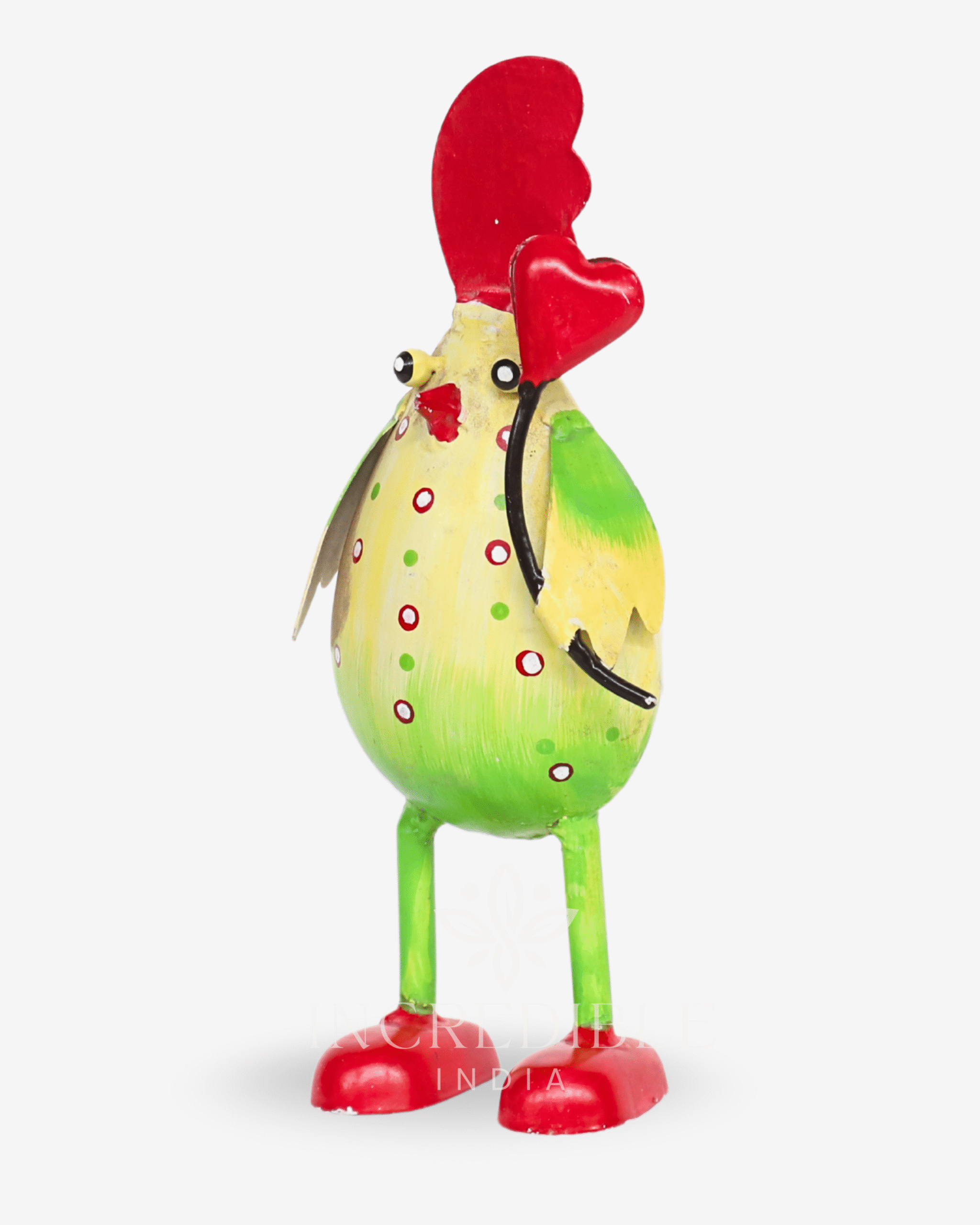 Add a splash of charm and joy to your decor with this adorable handcrafted metal rooster. Painted in bright green with red polka dots and oversized red boots, it holds a little heart-shaped balloon—perfect for spreading smiles and warmth in any room.